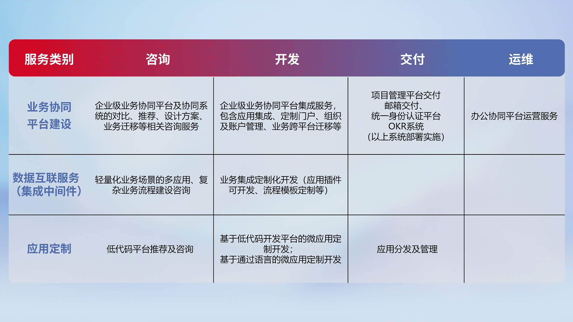 针对钉钉、、企微、、、、IDaas等平台级产品提供产品的规划、、、、方案、、、、交付、、、、定制化开发等服务,,,,实现如统一协同办公、、智能客户服务、、混合会议管理、、智能数据查询、、、、等业务场景,,,实现数字化转型。。。
