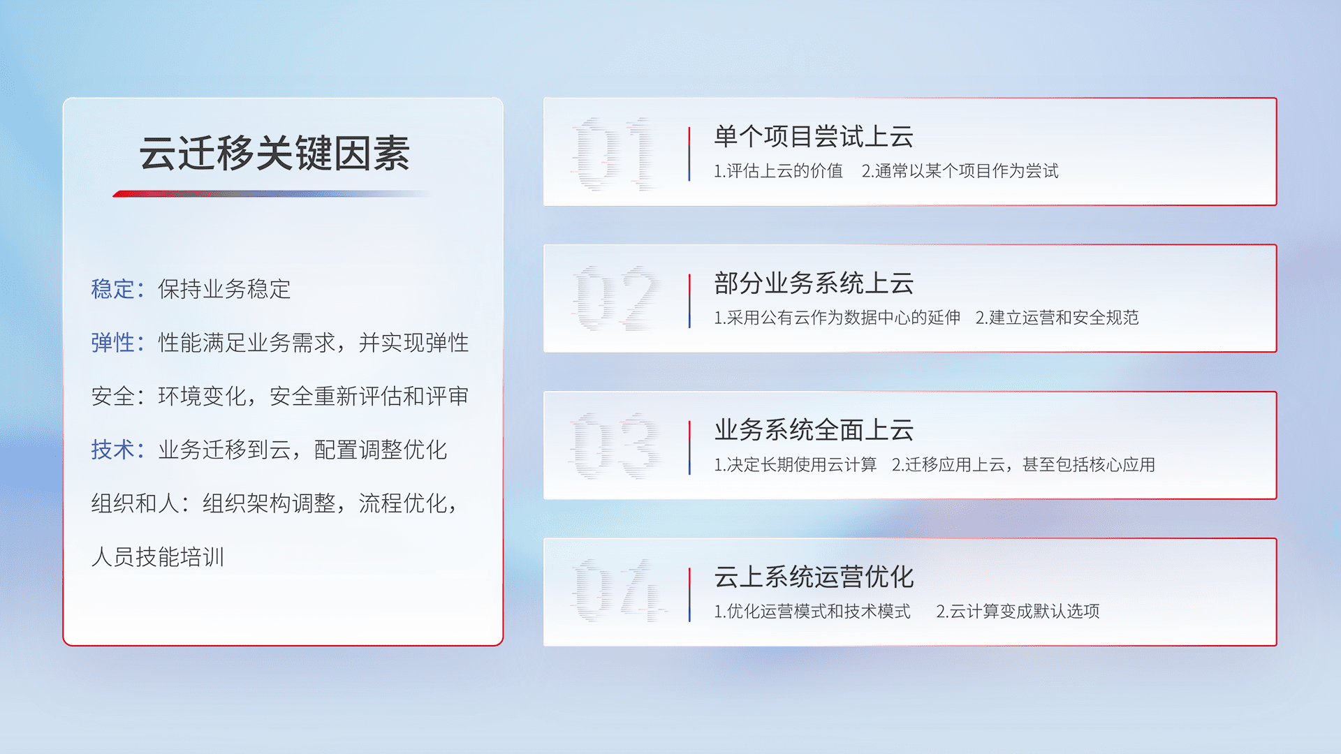 结合实际业务,,,,从规划设计、、、、云平台选型、、云原生改造、、、数据迁移、、、集成交付,,,,迁移全过程为客户识别最佳上云路径,,,,做好风险识别管理,,,,设计网络架构、、身份权限、、、安全审计合规、、操作审计、、日志审计、、、、监控告警策略、、、多站点容灾设计等,,,,对云上基础设施进行整体规划,,,,提升IT治理水平,,,,以满足弹性、、、高可用、、、高性能的需求。。